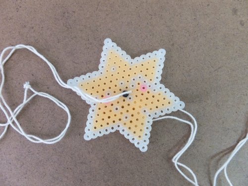 カードの裏に、短く切ったストロー2本を「ハ」の字型に貼り付け、糸を通すだけです。